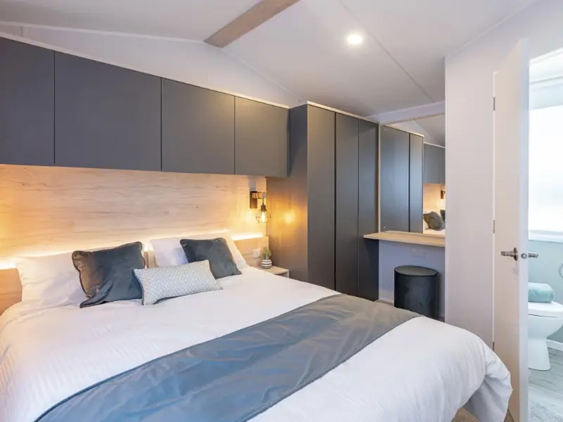 - Master bedroom with double bed, grey fitted wardrobes, and dressing table with stool