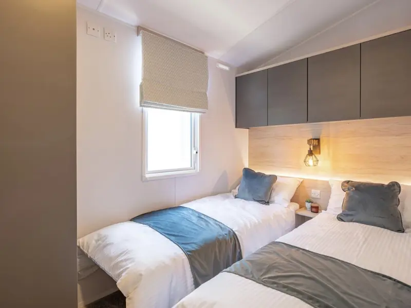 - Twin bedroom with built-in wardrobes, overhead storage, and optional pull-out beds