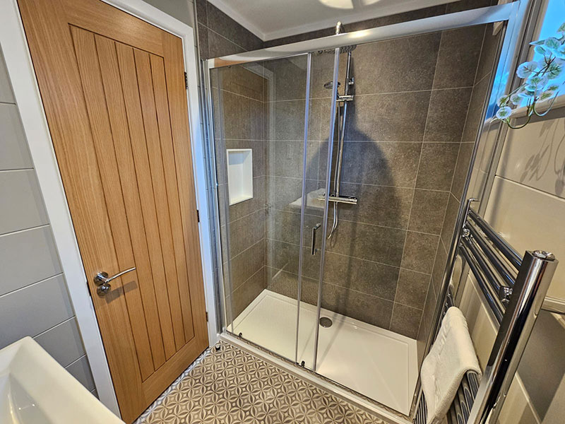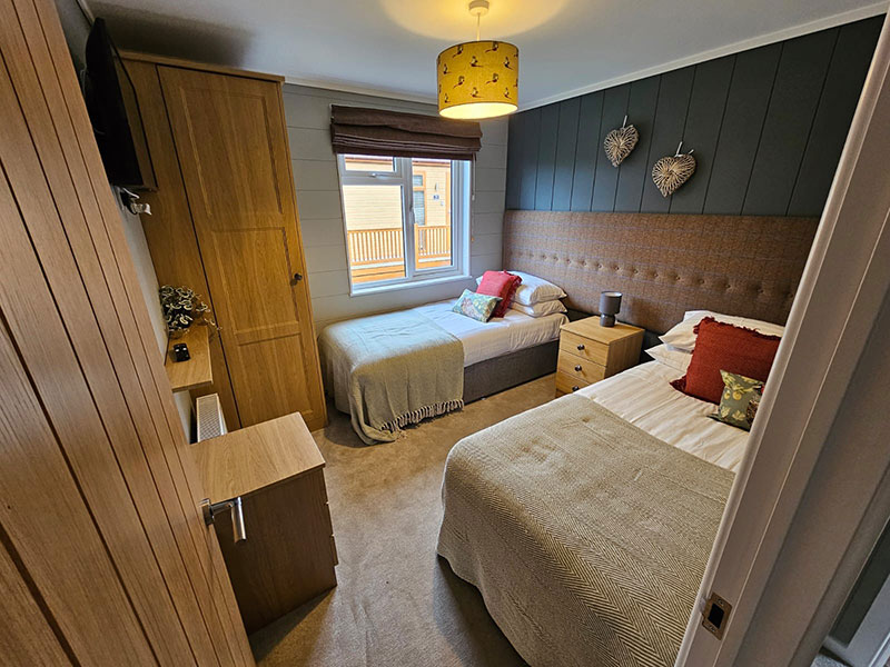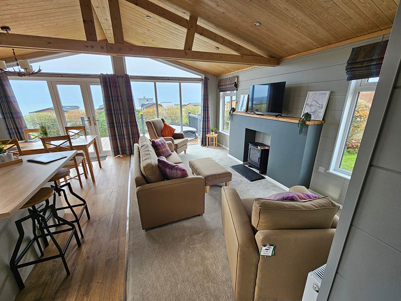 Celtic Crossing lodge has a charming and luxurious interior. Vaulted timber ceilings, exposed beams and a beautiful feature fireplace set the scene for relaxing after days of exploring and outdoor pursuits. Practical touches include a boot and utility room complete with bench seating, coat and shoe storage and washing machine. It has solid oak interior doors and freestanding bedroom furniture. The lodge offers a king size master bedroom with en suite shower, a twin/super king bedroom and a contemporary family bathroom. Both bedrooms have their own tv and both bathrooms have shaver sockets. An open plan living and dining area with sea views and a modern kitchen provide a great relaxing space. Celtic Crossing also benefits from a private sunken hot tub, decking with outdoor furniture facing the setting sun and BBQ area, parking for two cars, pet friendly accommodation and non smoking policy make this lodge a luxurious country and ocean-side escape.