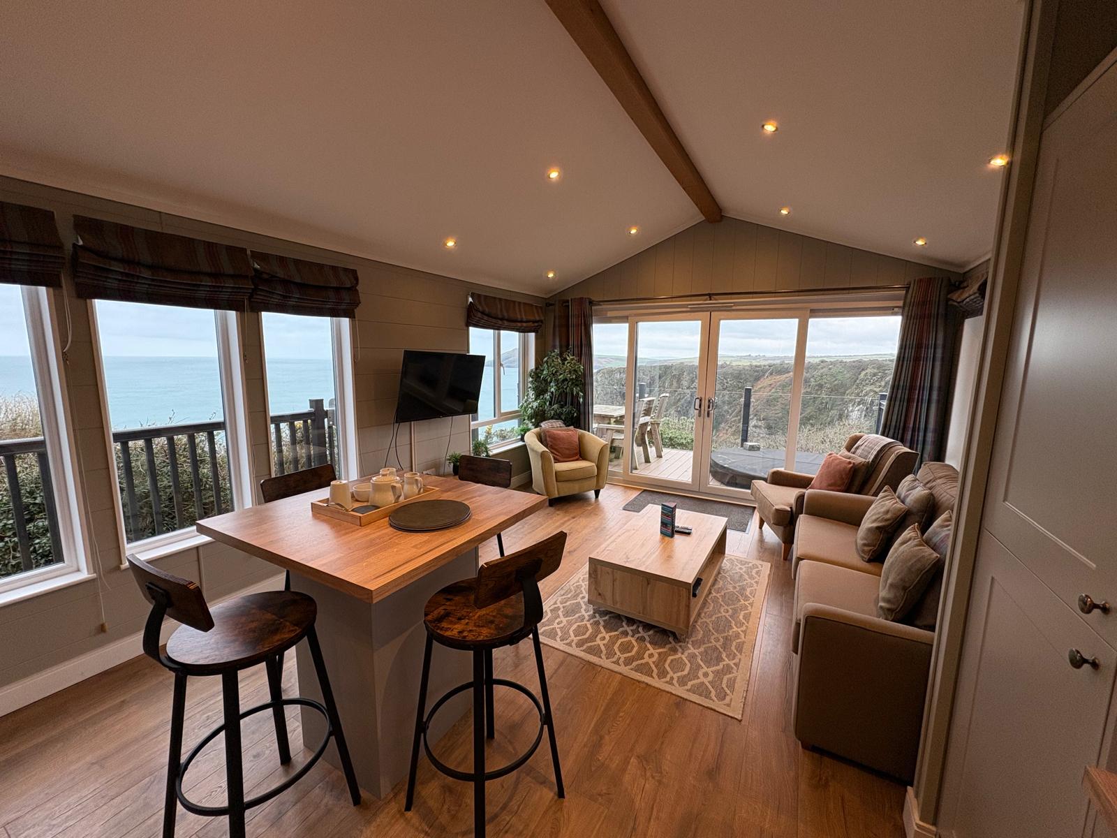 - Expansive open-plan living and dining area with French doors to decking with cliffside views