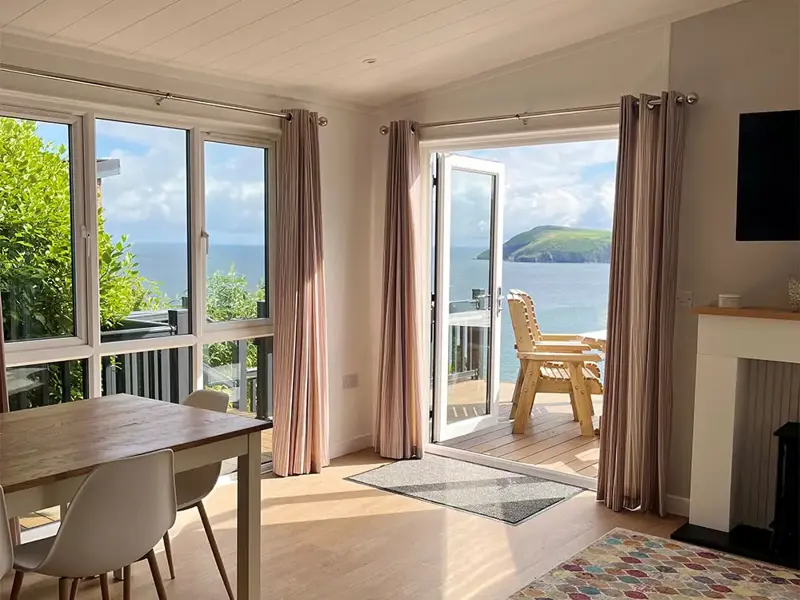 Lodge perched on the cliffs offers breathtaking sea views, allowing you to admire the beauty of Dinas Head and the vast ocean. With three bedrooms, it’s perfect for a large family. The luxurious living and dining area, along with comfortable bathrooms, create a picturesque retreat. And that patio overlooking the ocean, Imagine relaxing in the hot tub, surrounded by nature.