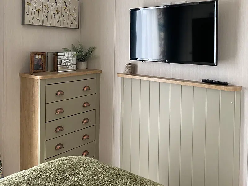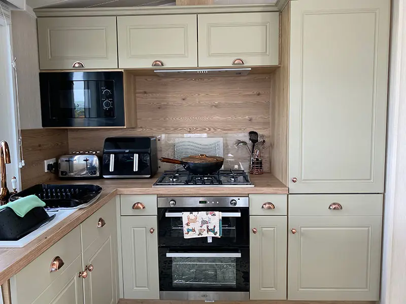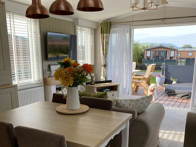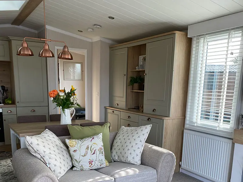 With the offer of outstanding storage, luxurious features, and stunning looks, the Vendee keeps everyone cozy with a welcoming interior and central heating. An open-plan kitchen, dining and living area sits at its heart, complete with free-standing sofas, a contemporary electric 2kW Optiflame® stove fire and a TV unit. The classic country kitchen includes a Belling stainless steel oven and integrated microwave, wine rack and A+ rated double door fridge/freezer, beside a designer dining table
